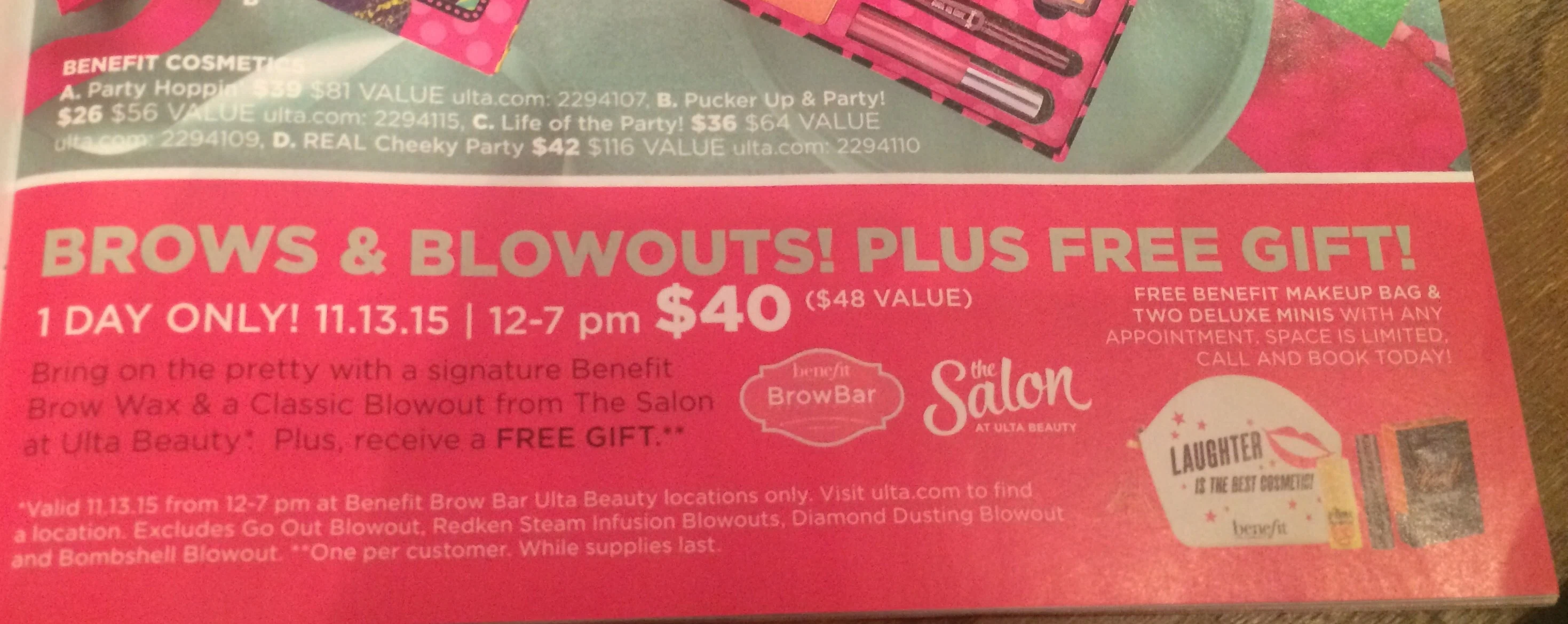 - Book a Benefit Brow Wax and a Classic Blowout from the Salon at Ulta - $40 (value $48)