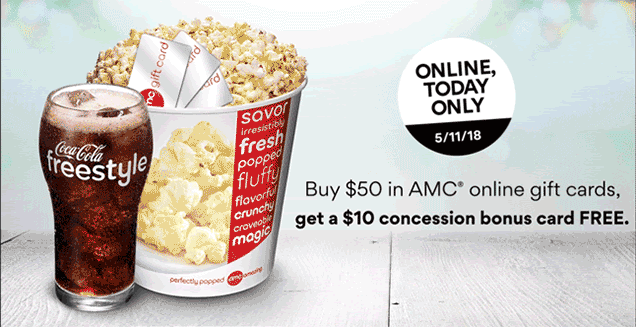 AMC Theatres - May 11 only! BUY $50 in egift cards and get a FREE $10 concession bonus card The $10 concession bonus card is valid May 12 – June 30.More info here